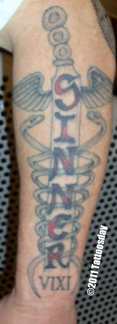The base of the tattoo may look familiar, as it resembles the caduceus, which is now a symbol of the medical profession.